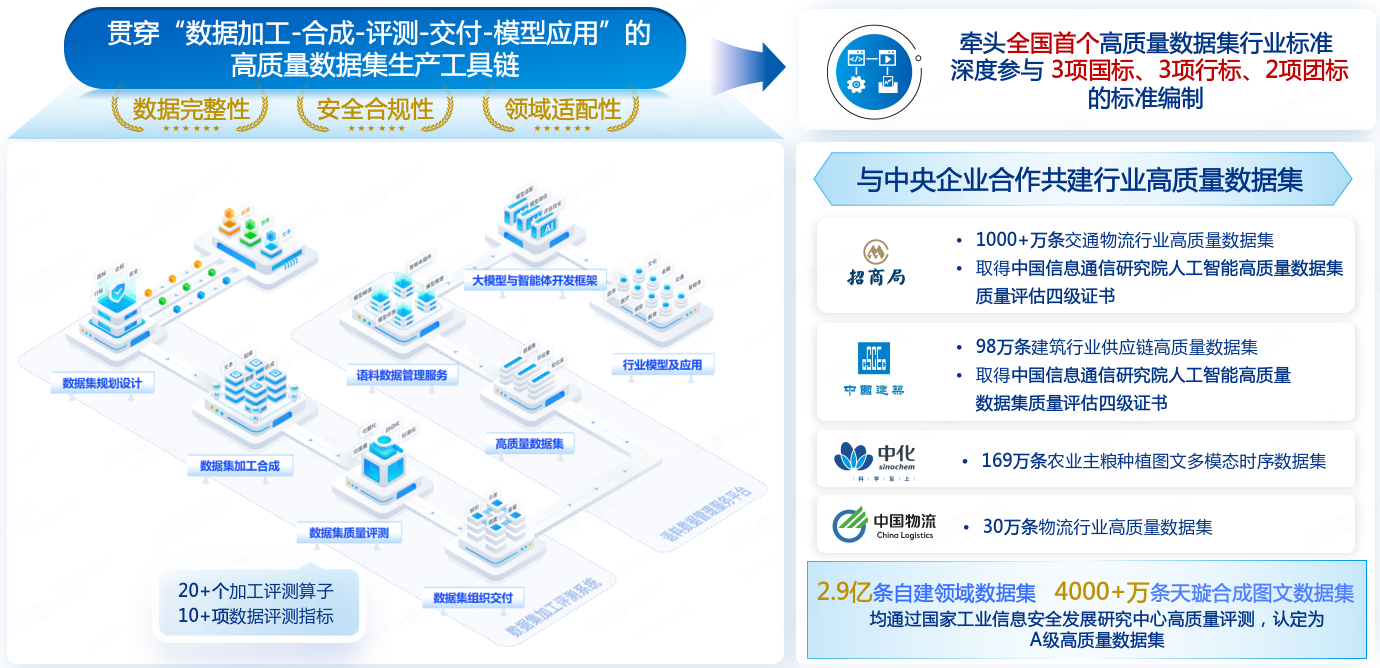 高质量的数据集是AI智能程度的关键。中国电子牵头制定了全国首个高质量数据集行业标准,并深度参与了3项国标编制。其自建的领域数据集通过国家权威评测,获得A级认证,为AI提供了丰富的“营养基”。