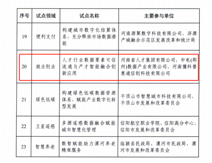 近日,河南省发展和改革委员会发布《关于印发首批河南省重点领域数据资源开发利用试点名单的通知》,数据产业集团旗下中电(郑州)数据产业有限公司联合河南省人才集团有限公司、河南豫科普惠通信创科技有限公司,申报的“人才行业数据要素可信流通与产才智能融合创新应用”(就业创业领域)项目成功入选全省首批数据资源开发利用试点。