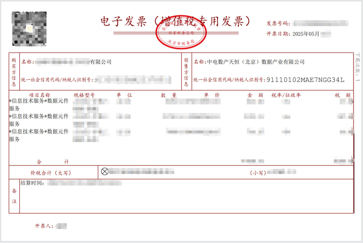 近日,中电天恒开具了北京市第一张数据元件发票,标志着北京市西城区基于数据元件的数据基础设施试点建设运营工作取得突破性进展,验证了“数据基础设施-元件加工-场景赋能”全链条闭环。中电天恒开具的北京市首张“数据元件”发票,主要是服务金融信用场景。在合规授权链完整的情况下,通过融合多方数据源开发金融系列数据元件,为下游的金融科技服务企业提供安全合规的数据元件调用服务。